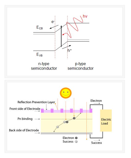 2) Pair of electron and electron hole is generated when it is exposed in sunshine that has greater energy than Band gap energy of semiconductor